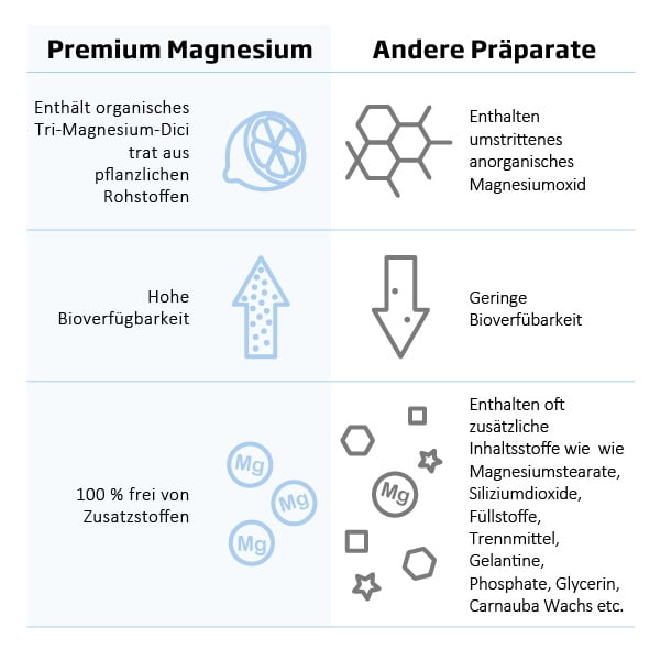 Das Tri-Magnesium-Dicitrat, welches wir für unser Premium Magnesium verwenden, wird sehr aufwendig aus pflanzlicher Zitronensäure hergestellt. Magnesium-Citrate werden vom Körper sehr gut aufgenommen, wie einige Studien gezeigt haben. Es ist bekannt, dass leider viele Produkte am Markt preiswertes anorganisches Magnesiumoxid enthalten. Dessen Bioverfügbarkeit ist für den menschlichen Körper aber umstritten.