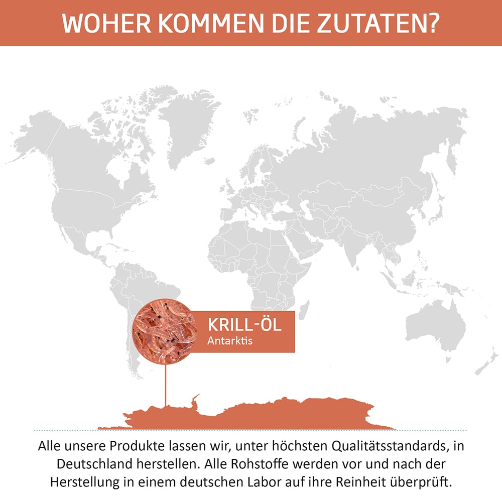 Krill steht am Anfang der Nahrungskette und kommt aus den saubersten arktischen Gewässern dieser Welt. Eine Belastung durch Schadstoffe ist somit auszuschließen.