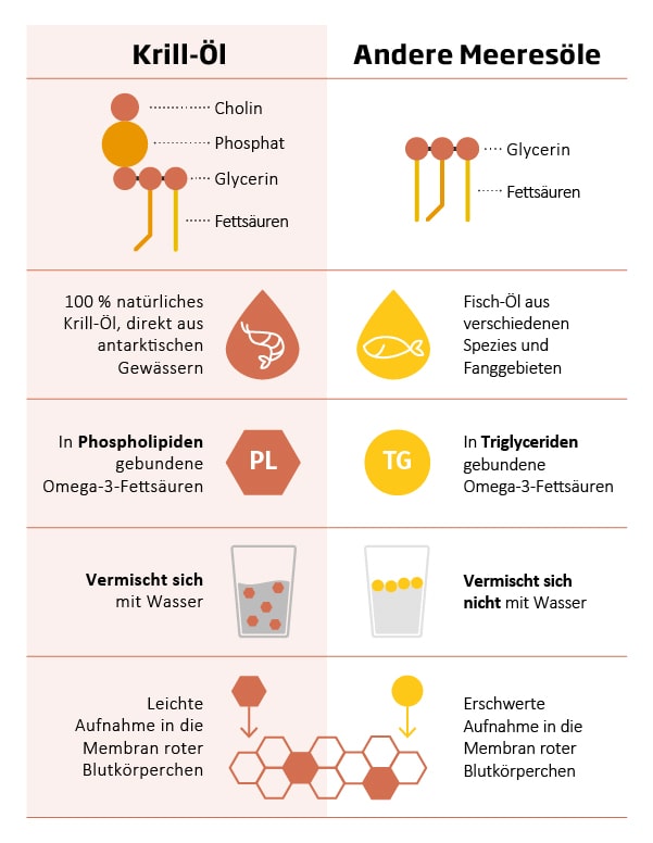 Beim Krill-Öl sind die Omega-3-Fettsäuren in Phospholipide eingebunden, die gleichen Verbindungen wie in unseren Zellen. Daher werden sie vom Körper besonders gut aufgenommen.