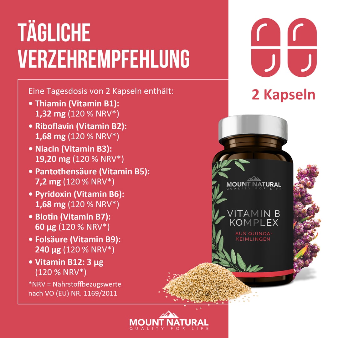 Der Körper braucht viele wichtige Nährstoffe um optimal versorgt zu sein. Ohne diese Stoffe fehlen dem Körper wichtige Bausteine für unterschiedlichste Funktionen. Nicht immer gelingt es uns, die richtige Menge über unsere Nahrung aufzunehmen. Nur zwei Kapseln unseres Vitamin B Komplexes aus Quinoakeimlingen versorgen Sie zu 120 % des NRV (Nutritional Reference Value). Das ist der Nährstoffreferenzwert. Dieser gibt die Menge der Spurenelemente, Mineralstoffe und Vitamine an, die eine durchschnittliche Person täglich zu sich nehmen sollte.