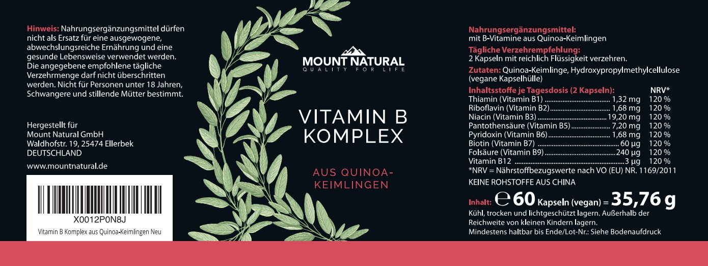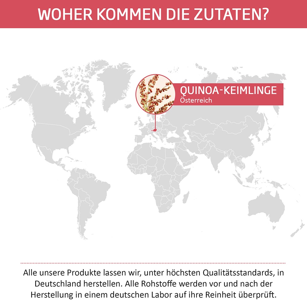 Wir beziehen die Quinoakeimlinge für unser Vitamin B Komplex ausschließlich aus Österreich. Es handelt sich um ein zu 100 % natürliches Produkt. Die fertigen Kapseln werden von einem unabhängigen Labor auf Keime, Schwermetalle und Pestizide untersucht. Erst wenn die Reinheit und Qualität der Produkte sichergestellt ist, werden die Kapseln zum Verkauf angeboten.