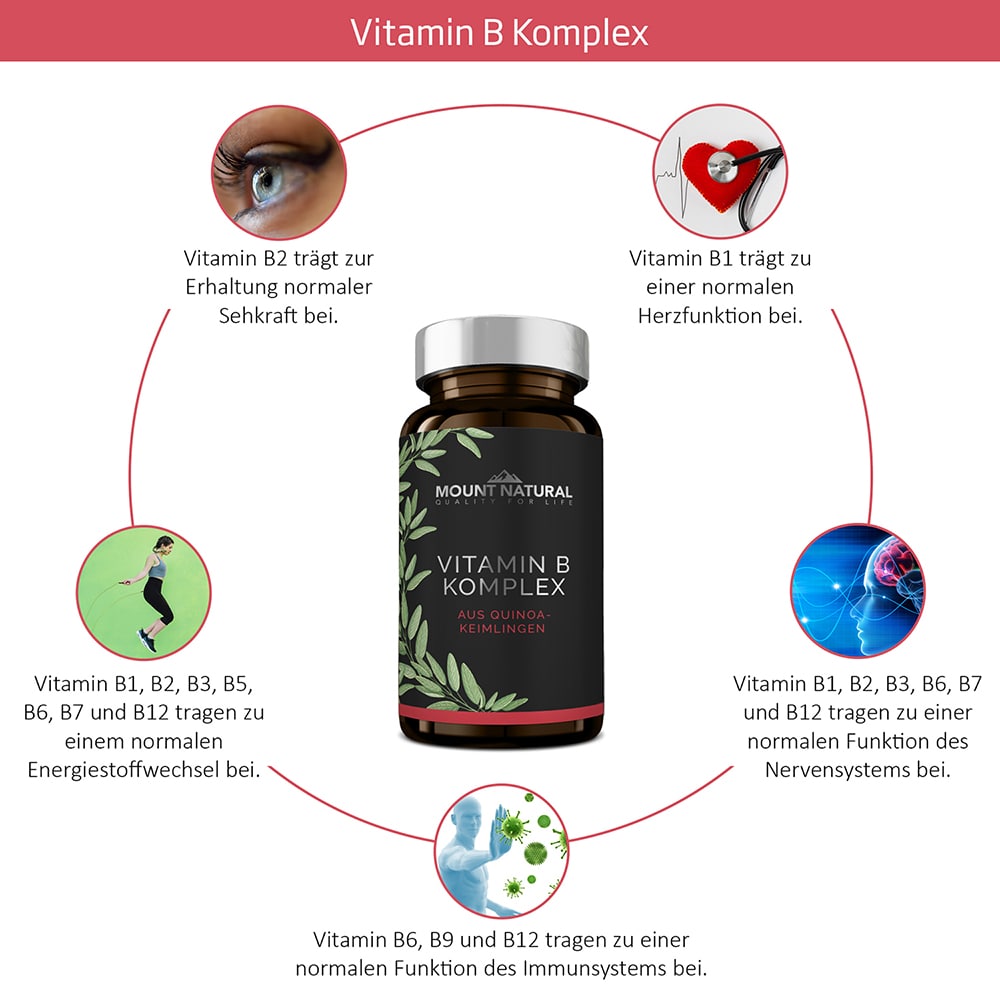Damit die einzelnen B-Vitamine ihre Wirkung im Körper optimal entfalten können, benötigen sie die anderen B-Vitamine und ihre Vitalstoffe. Nimmt man nur ein Vitamin B Präparat, kann es sein, dass trotz regelmäßiger Einnahme ein Mangel entsteht. Ein möglicher Mangel eines B-Vitamins kann zur Folge haben, dass die Wirkung eines anderen B-Vitamins beeinflusst oder einschränkt wird. Mit der Einnahme eines Vitamin B Komplexes sind Sie sicher mit allen 8 essenziellen B-Vitaminen versorgt.