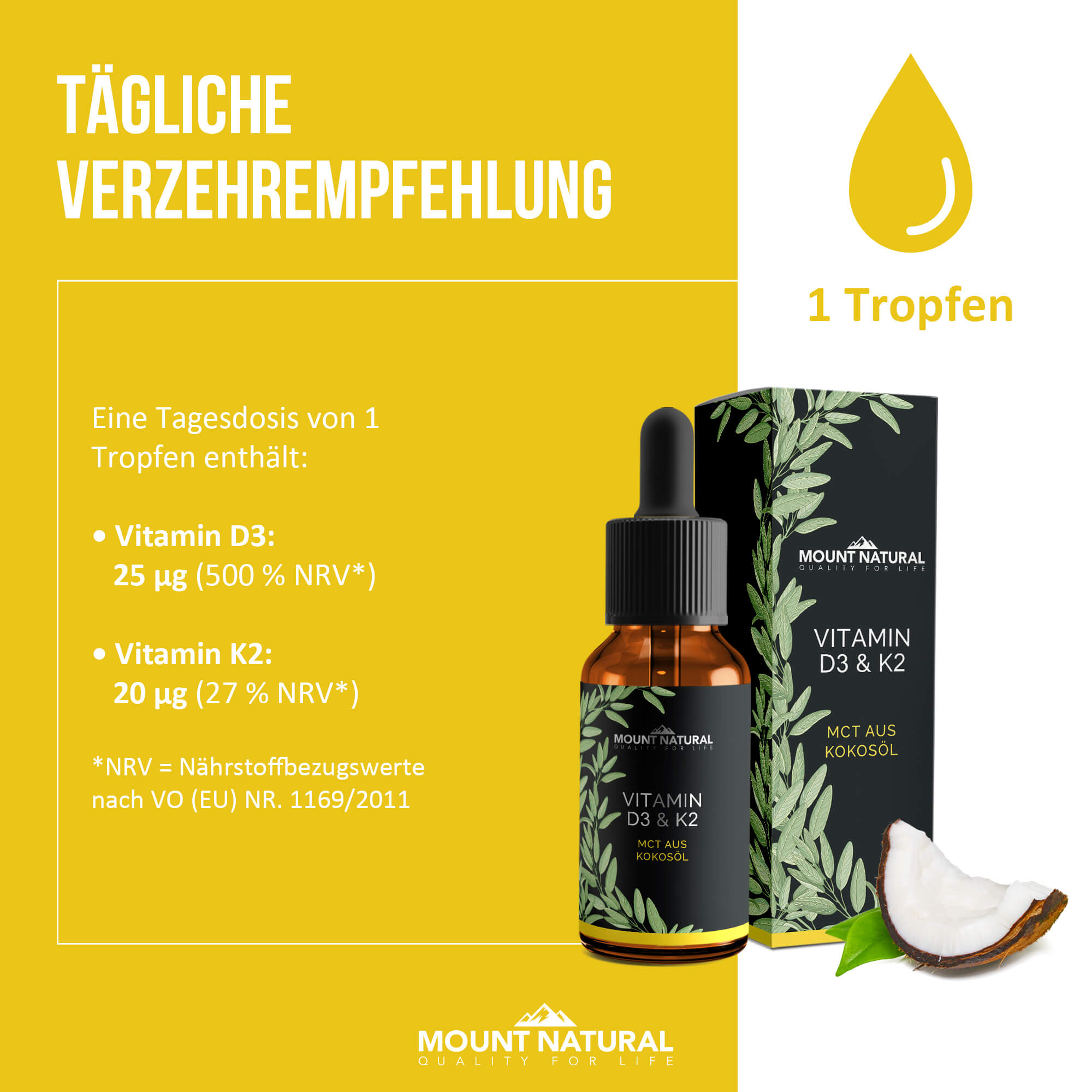 Mit unserem MOUNT NATURAL Vitamin D3 & K2 mit MCT aus Kokosöl sorgen Sie für eine ausreichende Versorgung Ihres Körpers mit dem Sonnenvitamin – auch in der dunklen Jahreszeit. Die Gesunderhaltung von Immunsystem, Knochen und Zähne werden durch die Einnahme unterstützt.