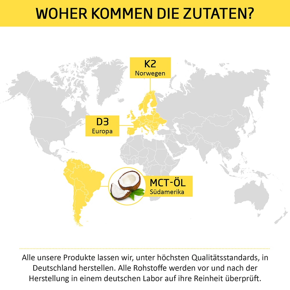 Das Vitamin D3 stammt aus Europa und das Vitamin K2 aus Norwegen. Wir verwenden nur das hochwertigste und effektivste Vitamin K2 (99,7%-All-Trans Menachinon MK7), welches einer ständigen Kontrolle des K2-Gehaltes unterliegt.