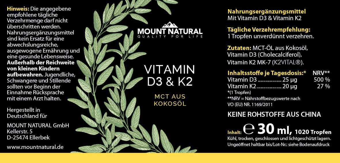 Zutaten: MCT aus Kokosöl, Cholecalciferol (Vitamin D3), Menachinon (Vitamin K2)