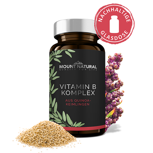Nur zwei Kapseln unseres Vitamin B Komplexes aus Quinoakeimlingen versorgen Sie zu 120 % des NRV* mit allen B-Vitaminen (B1, B2, B3, B4, B5, B6, B7, B9 und B12). Die natürlichen, organisch gebundenen und biologisch aktiven Nährstoffe erhöhen deren Bioverfügbarkeit.