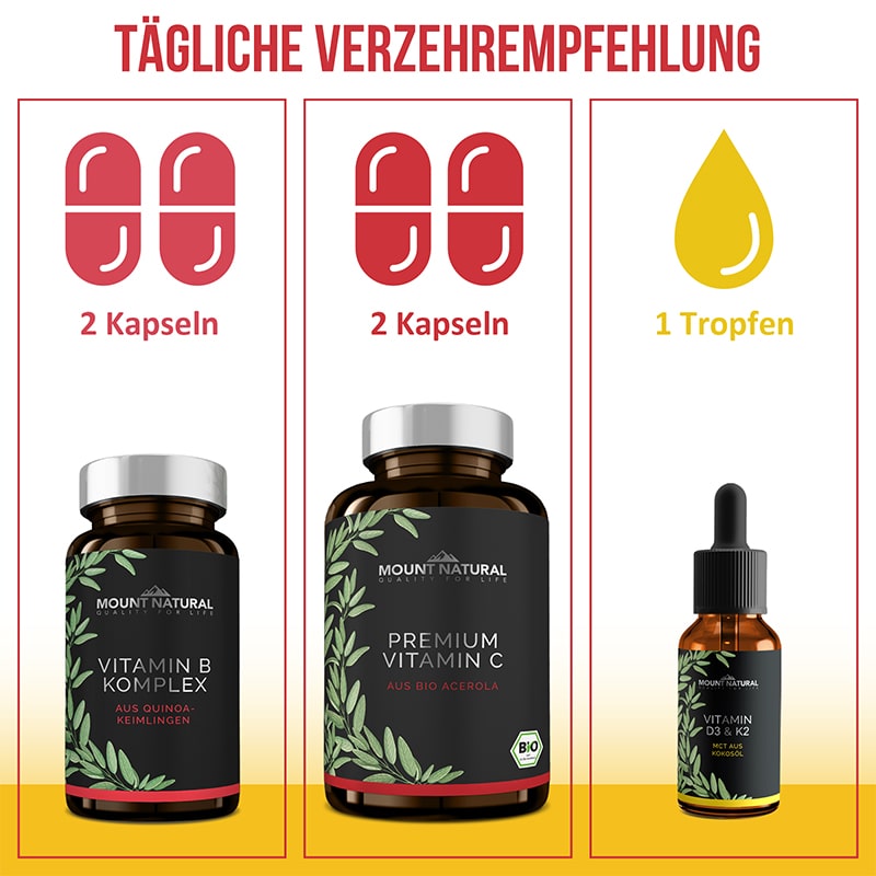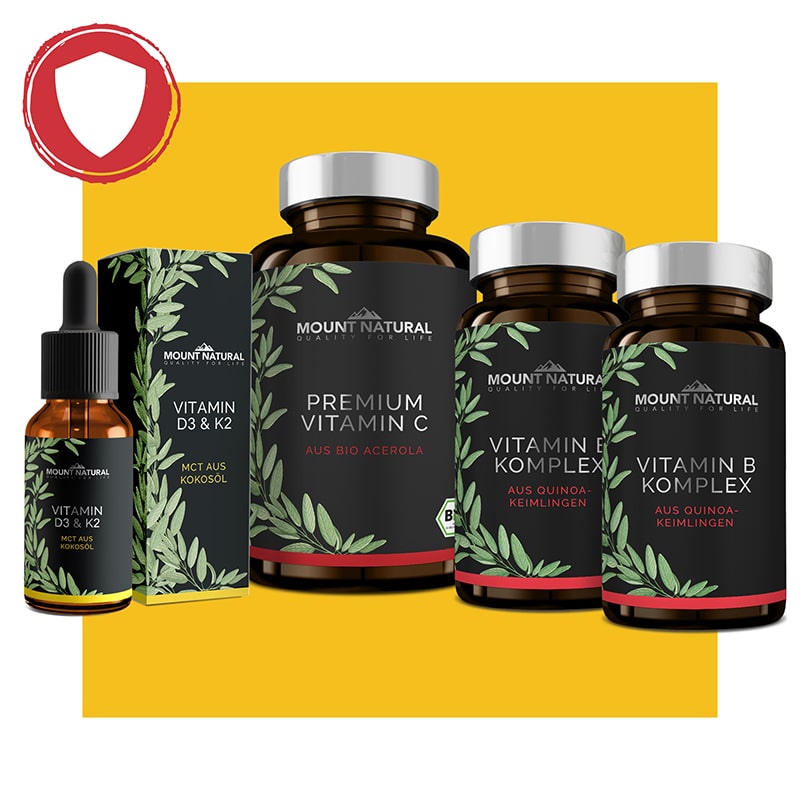 Unser Vitamin-Immun-Paket mit Vitamin C, Vitamin D3 & K2 sowie allen 8 B-Vitaminen unterstützt Ihr Immunsystem ganzheitlich auf natürlichem Wege.