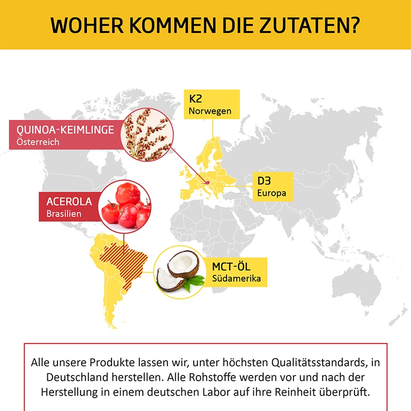 Da beide Vitamine fettlöslich sind, haben wir diese in Kokosöl gelöst, um eine hohe Bioverfügbarkeit sicherzustellen.